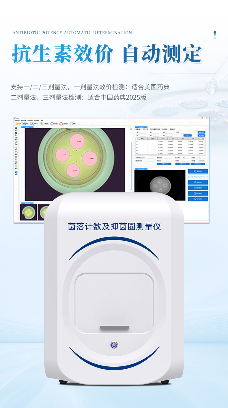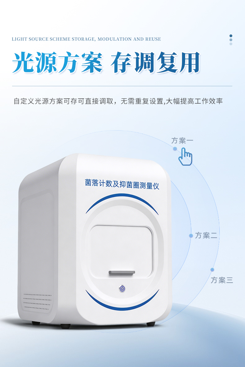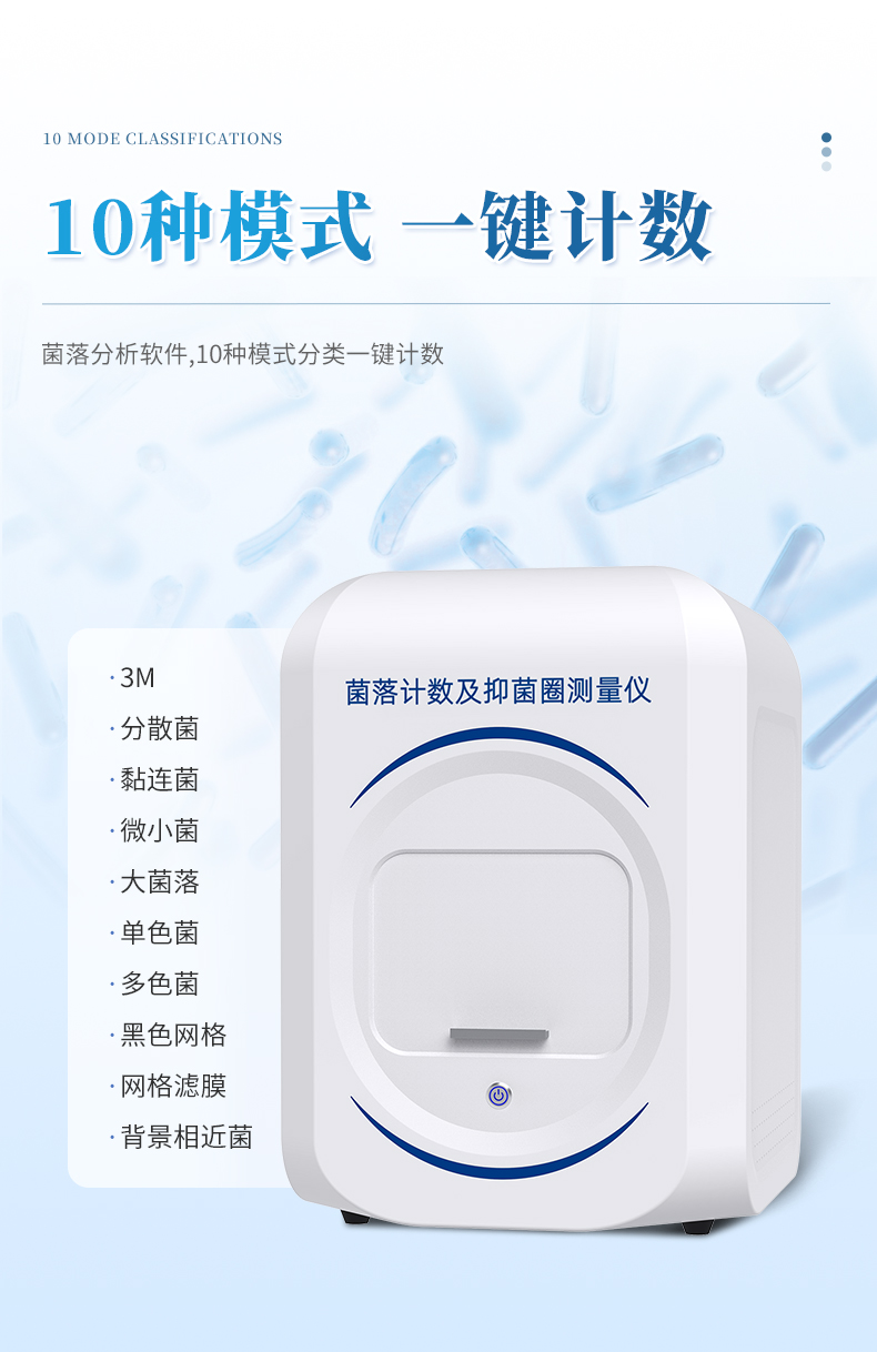 本产品是一款集图像采集、数据处理与统计分析于一体的全自动菌落计数及抑菌圈测量仪,广泛应用于食品、药品、化妆品、环境监测、医疗卫生、科研院校等领域。仪器采用先进的数字图像处理技术,具备荧光菌识别、抑菌圈测量及效价测定和杀菌功能,可快速精准完成培养皿内菌落的测量分析、抑菌圈测量及抗生素效价测定,大幅提升实验效率,有效降低人工操作误差。
