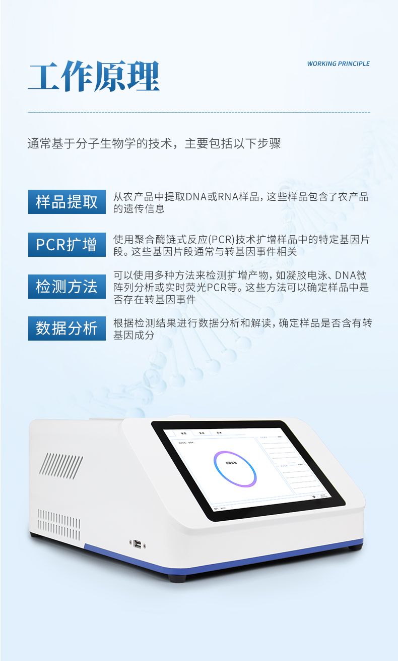 转基因检测仪的工作原理通常基于分子生物学的技术,主要包括以下步骤: