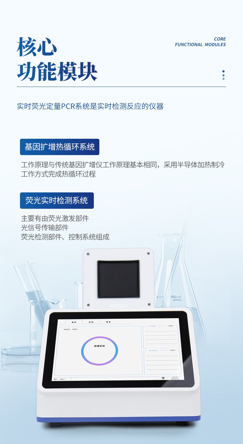 实时荧光定量PCR系统是实时检测反应的仪器,主要由基因扩增热循环系统、荧光实时检测系统、微电路控制系统、计算机及应用软件组成。其中两个核心功能模块:热循环系统和荧光实时检测系统。其中基因扩增热循环系统工作原理与传统基因扩增仪工作原理基本相同,采用半导体加热制冷工作方式完成热循环过程。荧光检测系统主要有由荧光激发部件、光信号传输部件、荧光检测部件、控制系统组成。