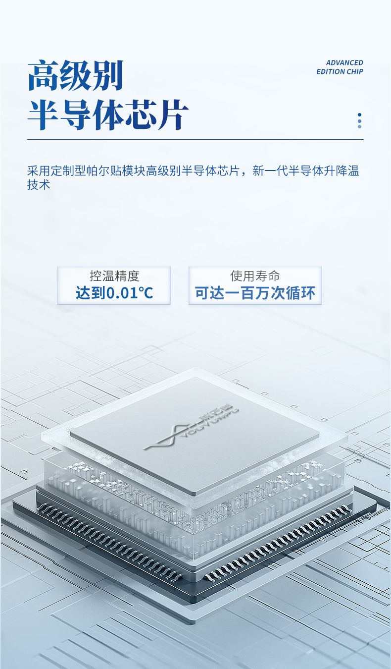 2、采用美国MARLOW定制型帕尔贴模块高级别半导体芯片,新一代半导体升降温技术,最快变温速率可达每秒7度,使用寿命可达一百万次循环;