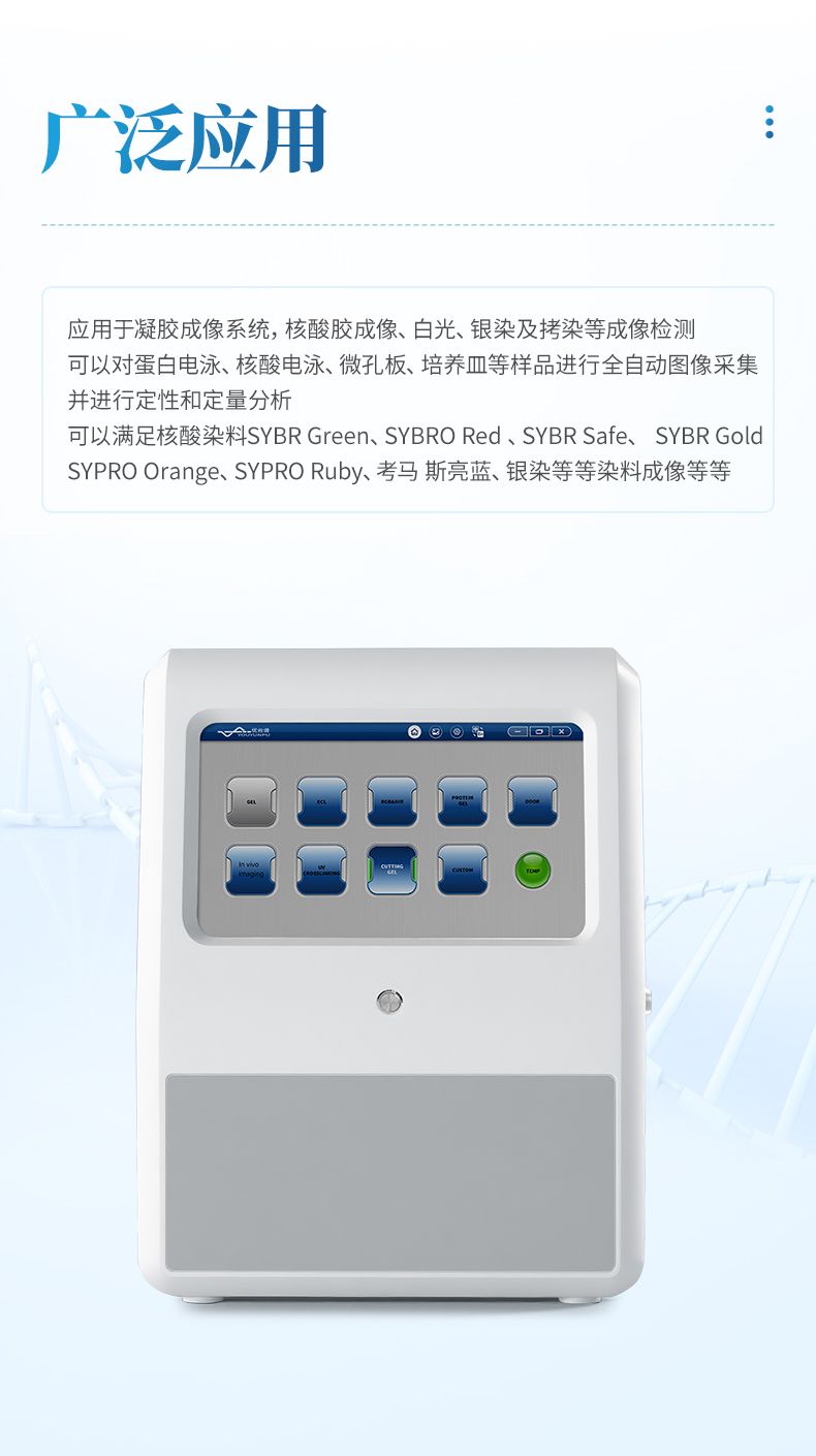 应用于凝胶成像系统,核酸胶成像、白光、银染及拷染等成像检测。可以对蛋白电泳、核酸电泳、微孔板、培养皿等样品进行全自动图像采集并进行定性和定量分析。可以满足核酸染 料 SYBR Green、SYBRO Red 、SYBR Safe、 SYBR Gold、SYPRO Orange、SYPRO Ruby、考马 斯亮蓝、银染等等染料成像等等