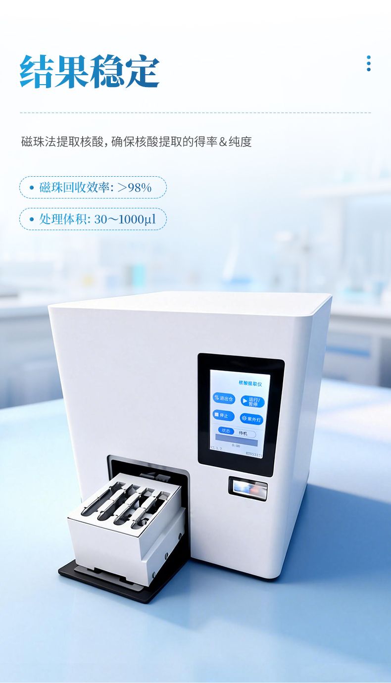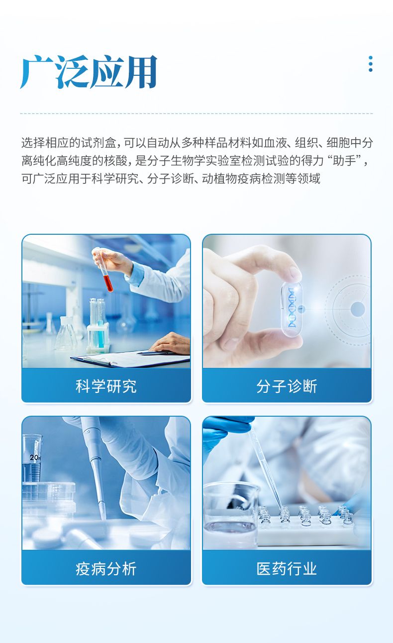 核酸提取仪通过磁珠法提取核酸,选择相应的试剂盒就可以自动的从多种样品材料如血液、组织、细胞中分离纯化高纯度的核酸。具有兼容性强(适配预封装提取试剂盒,也可适配单头份试剂)、提取速度快、提取回收率高、操作简便的优点,是分子生物学实验室检测试验的得力“助手”。可广泛应用于科学研究、分子诊断、动植物疫病检测等领域。